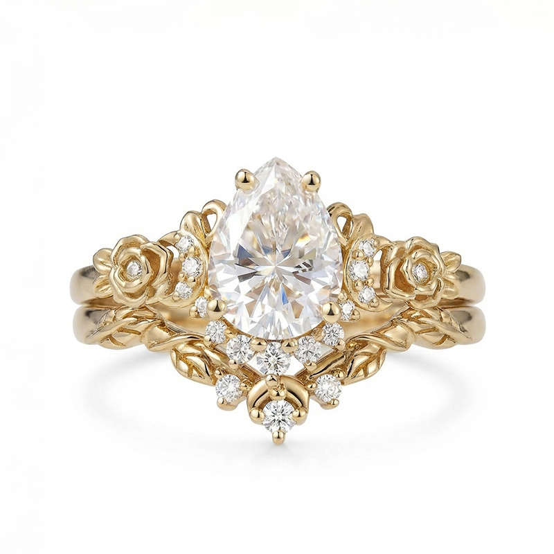 Sotiya Nature Inspired Floral Pear Cut Moissanite Enhancer Wedding Bridal Ring Set Sterling Silver