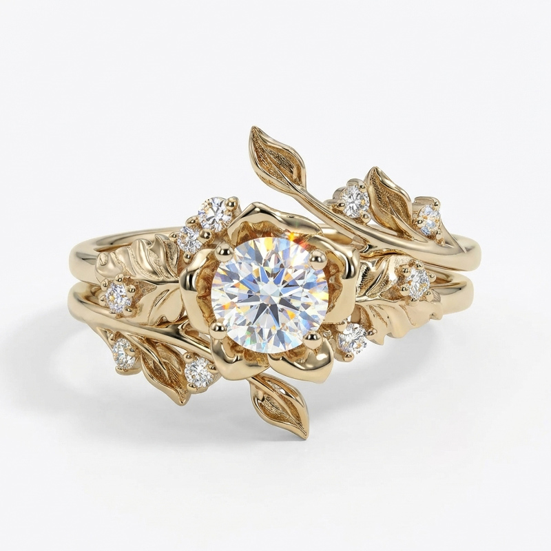 Sotiya Nature Inspired Floral Round Cut Moissanite Enhancer Wedding Bridal Ring Set Sterling Silver
