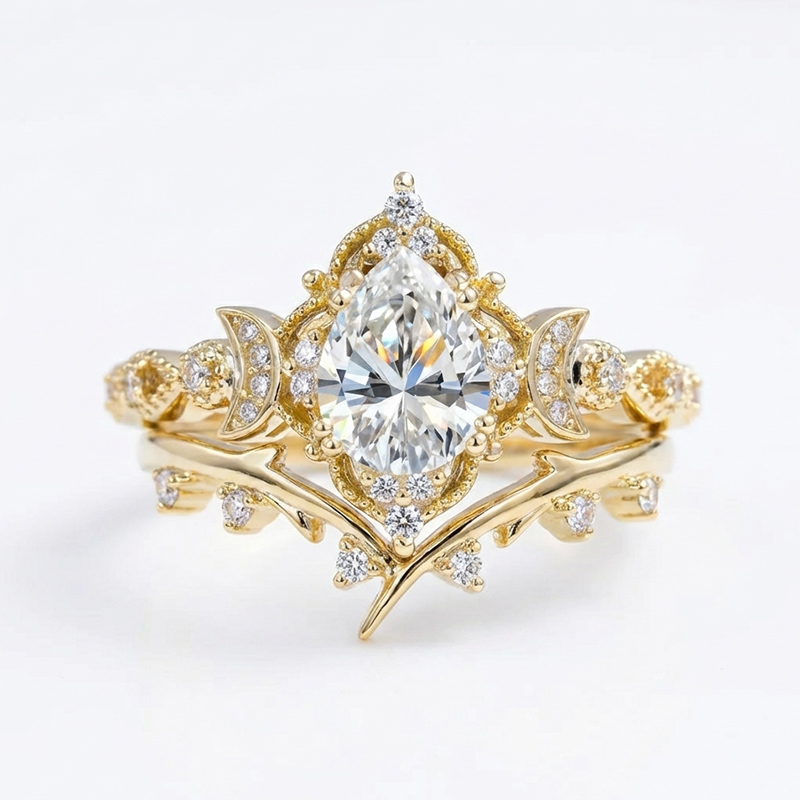 Sotiya Unique Milgrain Moon Pear Cut Moissanite Wedding Bridal Ring Set Sterling Silver
