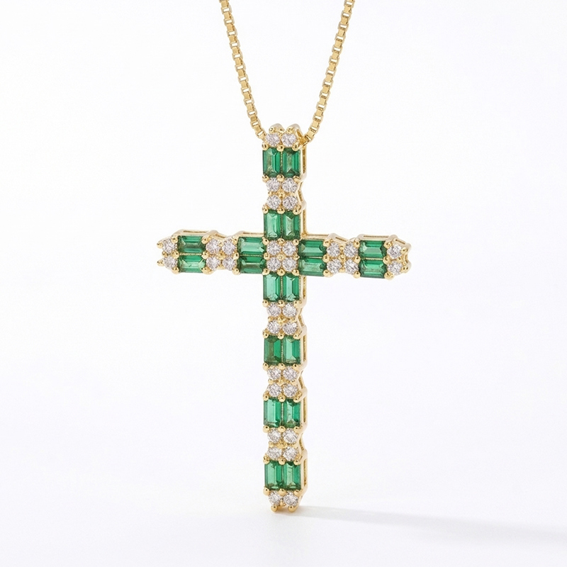Sotiya Faith Cross Design Emerald and Round Cut Necklace Sterling Silver