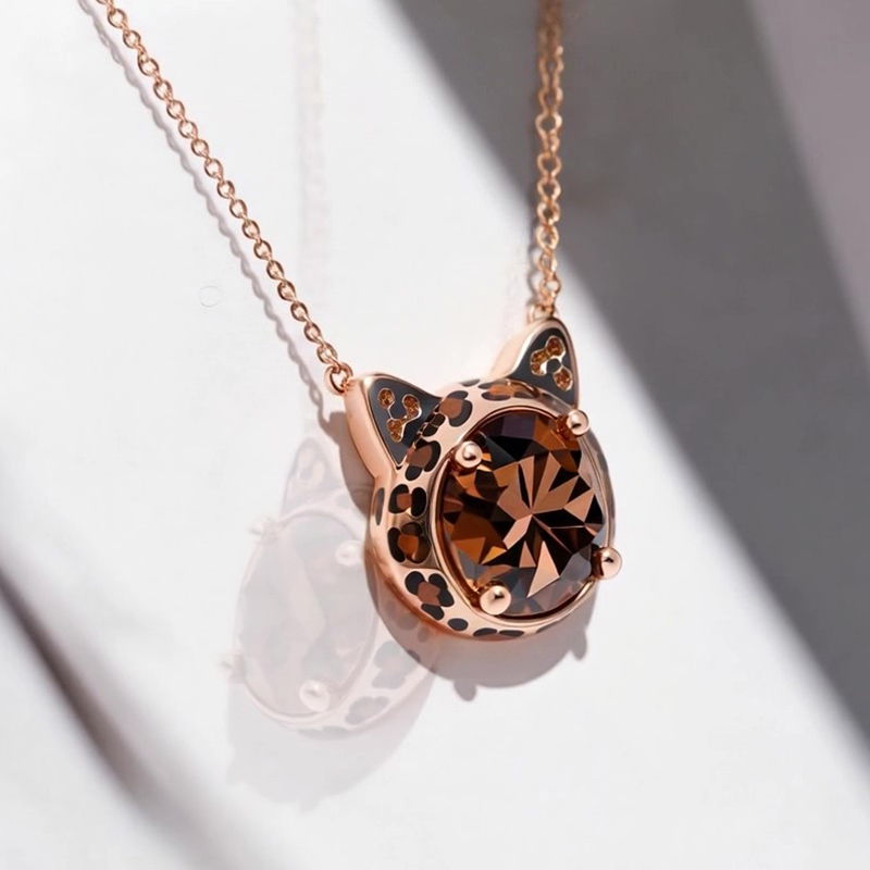 Sotiya Cat Design Round Cut Leopard Print Coffee Enamel Necklace Sterling Silver