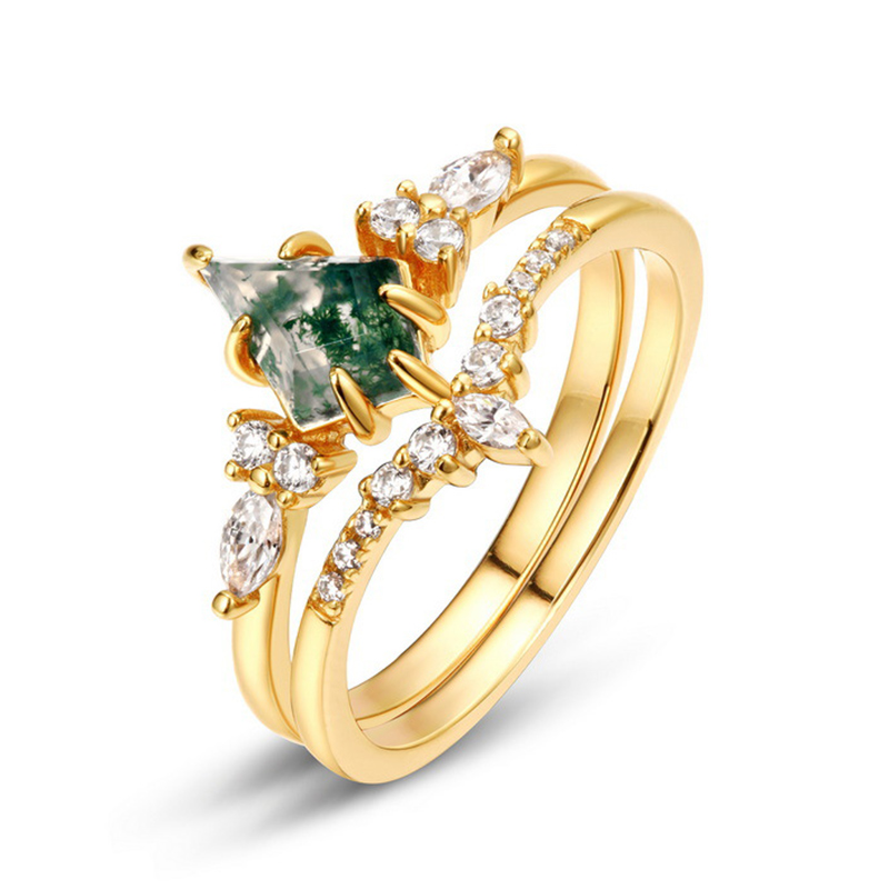 Sotiya Vintage Kite Cut Green Moss Agate Wedding Bridal Ring Set Sterling Silver