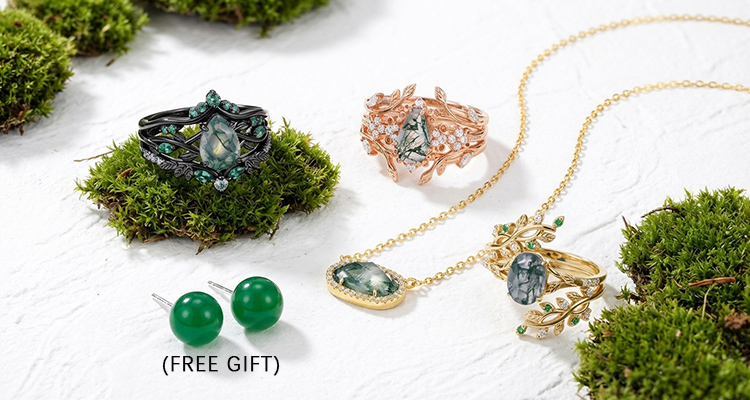 Sotiya Vintage Nature Inspired Oval Cut Green Moss Agate Enhancer Wedding Bridal Ring Set Sterling Silver