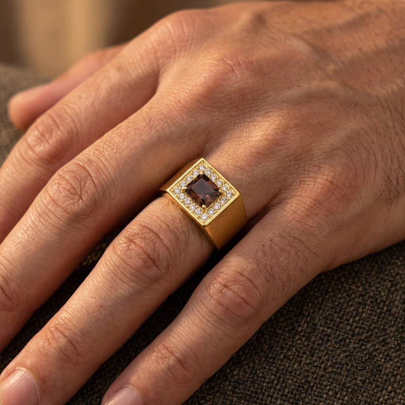 Sotiya Halo Rec Radiant Cut Coffee Gold Plated Men's Promise Ring Sterling Silver