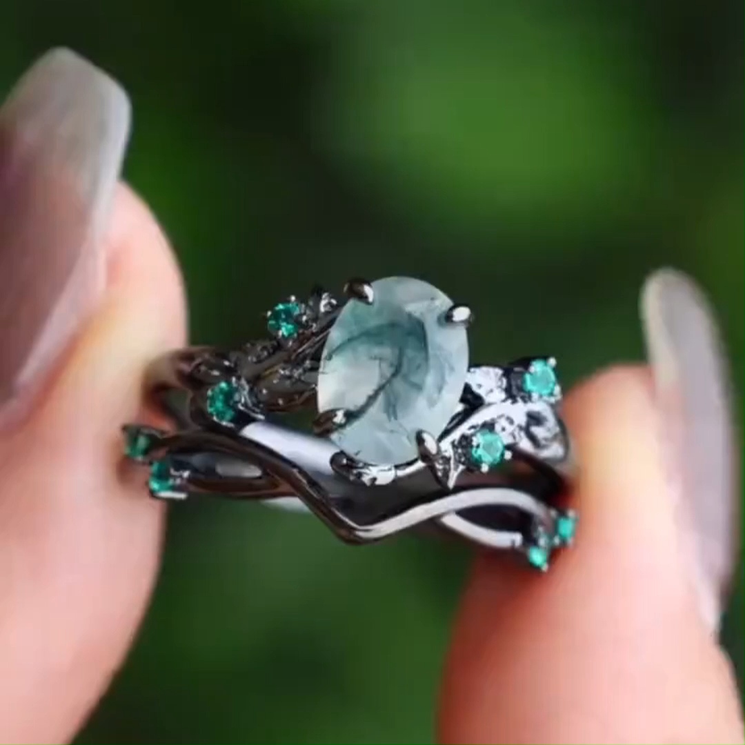 Sotiya Nature Inspired Oval Cut Green Moss Agate Wedding Bridal Ring Set Sterling Silver