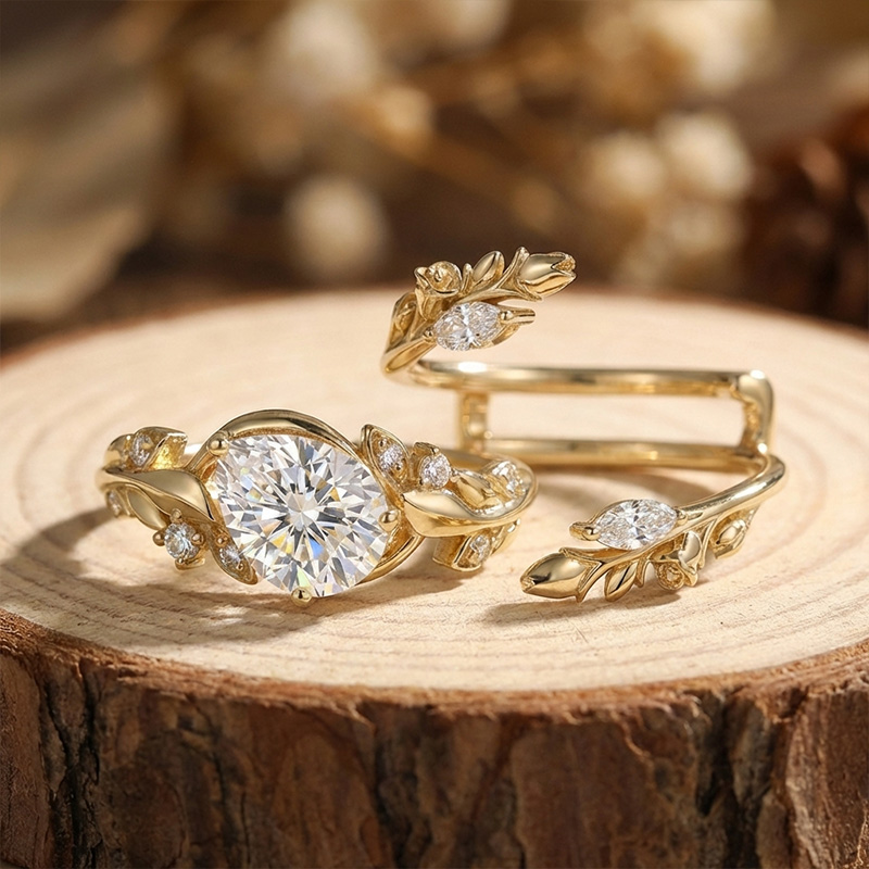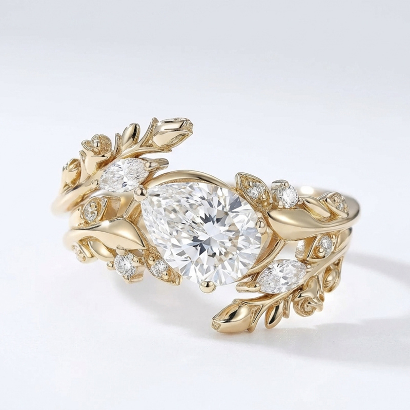 Sotiya Nature Inspired Leaf Pear Cut Moissanite Enhancer Wedding Bridal Ring Set Sterling Silver