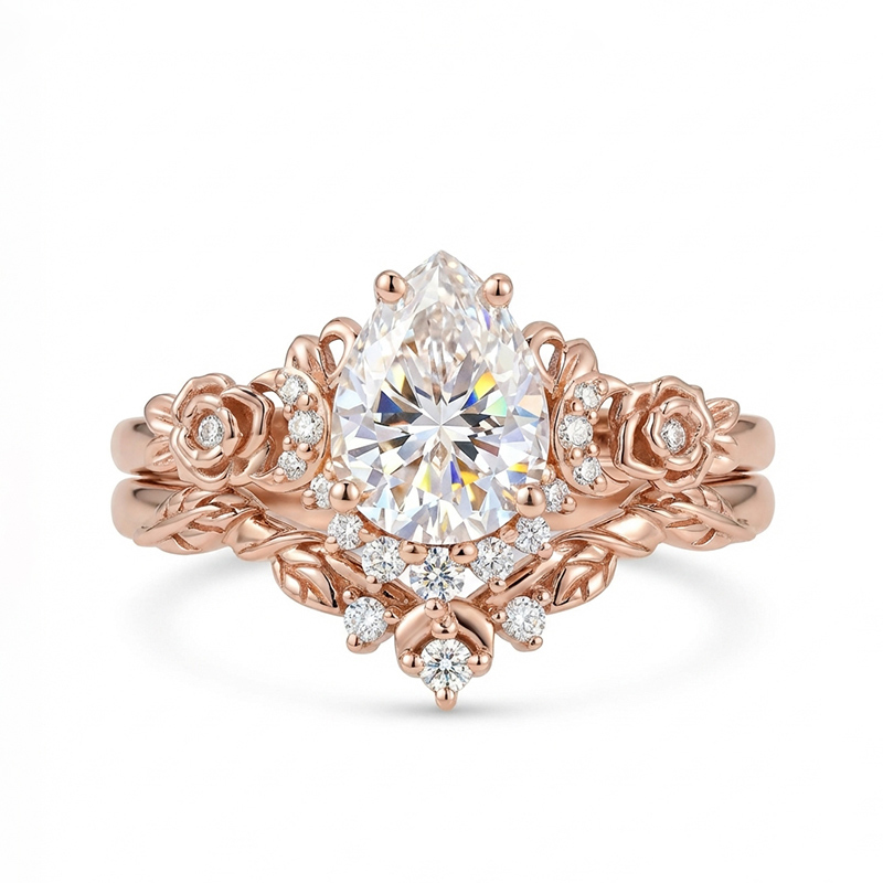 Sotiya Nature Inspired Pear Cut Moissanite Wedding Bridal Ring Set Sterling Silver