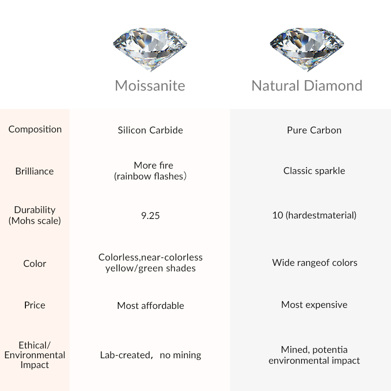 Moissanite has a different chemical makeup from natural and lab grown diamonds. While a diamond is pure carbon, moissanite is both silica and carbon. As a result, Moissanite sparkles differently, more even, and is slightly less hard than a diamond. However, it does look nearly identical to a diamond!