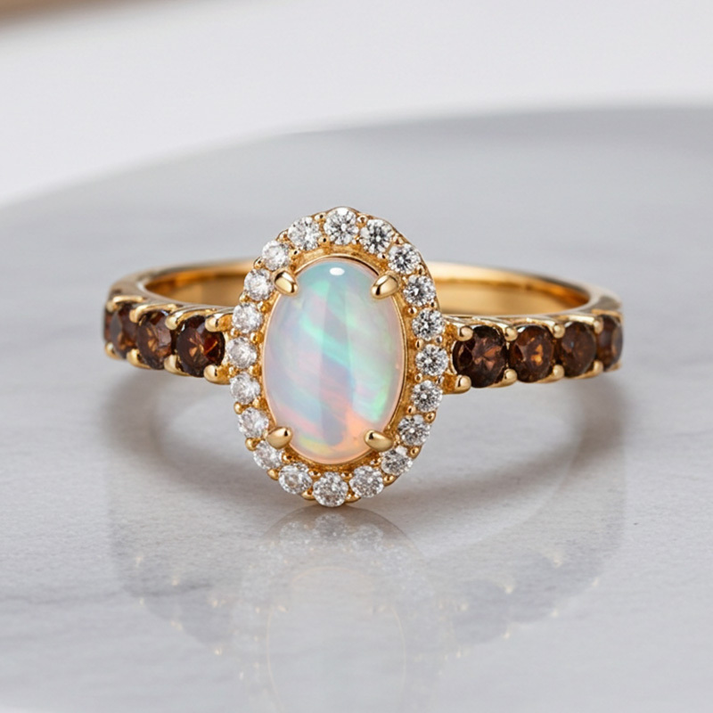 Sotiya Halo Oval Cut Opal Coffee Sidestone Engagement Ring Sterling Silver