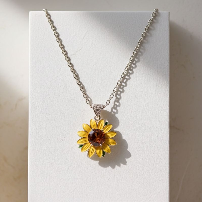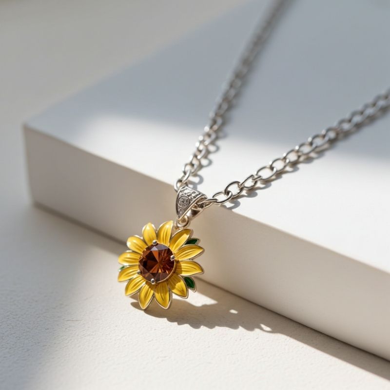 Sotiya Artist Collection Famous Painting Sunflower Enamel Round Cut Coffee Necklace Sterling Silver